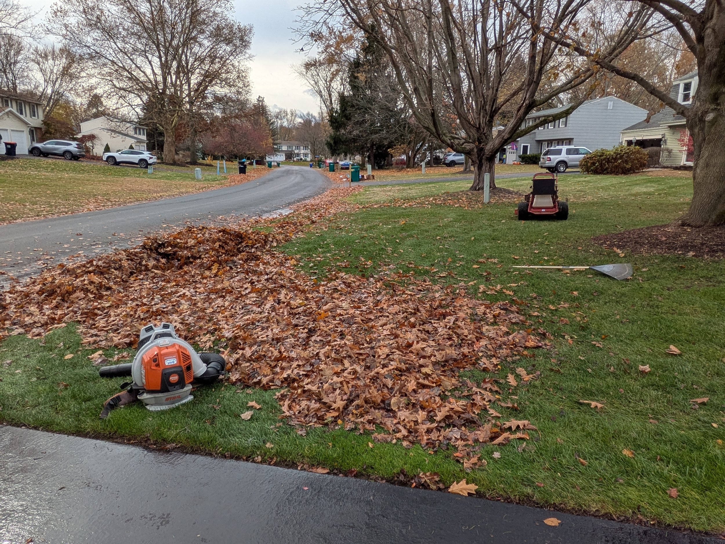 Fall leaf cleanups include weekly removal of leaves on your property to the curbside for town pickup. We can also locate leaves to forest/wood lines or elsewhere if requested.